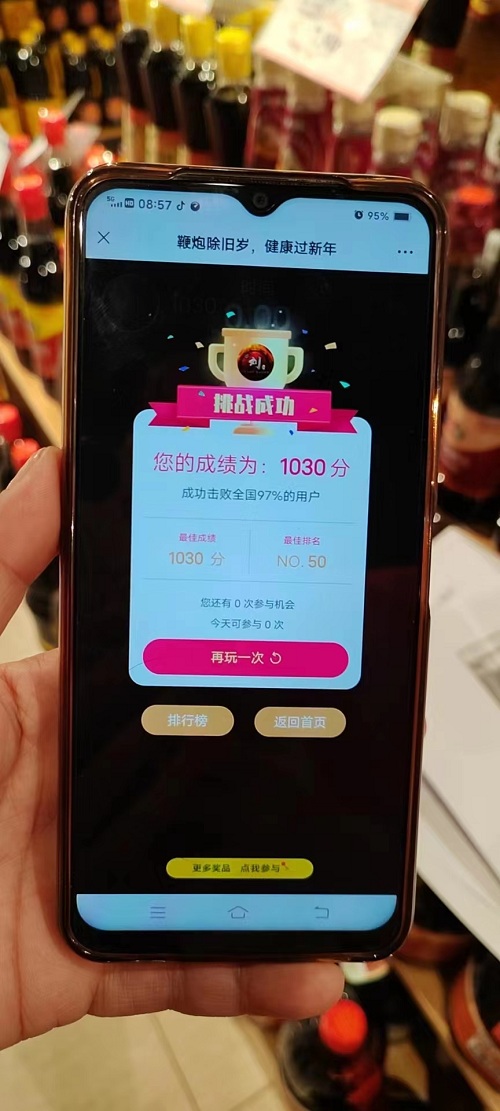 如果说去年的贴窗花活动让许多小伙伴们意犹未尽的话,那今年的放爆竹活动可真是让大家过足了瘾。这项活动不仅考验小伙伴眼明手快,而且要充分发挥小伙伴们的智慧,才能拿下最高分。在开始挑战之前,就有小伙伴邀约其他同事助力,齐心协力共同点燃爆竹,争取获得更高积分;还有的小伙伴凭借去年的丰富经验及娴熟的技巧,进入小程序后,熟练轻松地拿下了高积分。值得一提的是各个分会积极宣导工会活动,在例会上亲自传授经验,伴随着小伙伴的欢笑声,愉快的氛围达到最高点,开启了能量满满的每一天。