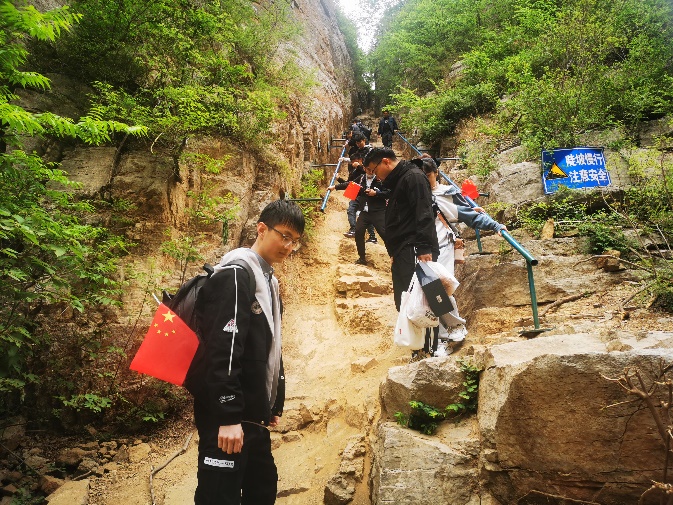 在团队队伍的最后,始终有两位压轴男队员,江扩天和汝国正,在徒步活动中起到了关键的作用,帮女生拿物品,背背包。此时通过一线天,仍然不卸武装,顺利穿越。李江波、车明虎、张浩、刘天宇、刘学胜等几位男生在陆续穿过一线天的时候,随时保护着搀扶着“女生”,就这样大家相互搀扶、勇敢迎接挑战,齐心协力成功穿越这一“天险”。