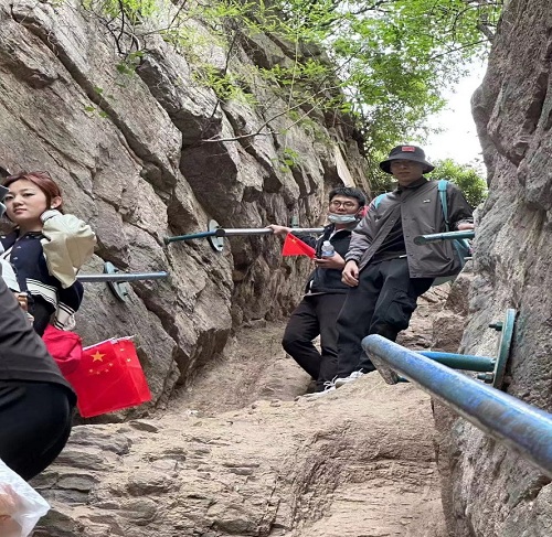 青年志愿者们果然不负众望,在艰难险阻面前,充分展现出华联人团结协作、互帮互助的精神。来自百货事业部的韩齐齐,在徒步过程中,一直最活泼。别看她身材娇小,在陡峭险情面前,却丝毫“不怯场”,很快便大胆的穿过一线天,并热心的在下面帮助接应着陆续下山的小伙伴。任晓莉在徒步前,表示面对稍微有点高的台阶,就腿部发抖,此时,面对更为陡峭的“一线天”,加上一直守护在她旁边的李瑶瑶等小伙伴们的鼓励和帮助,克服了心理障碍,勇敢顺利通过,当她从下往上看时,不免感叹,不敢相信自己原来这么“伟大”。